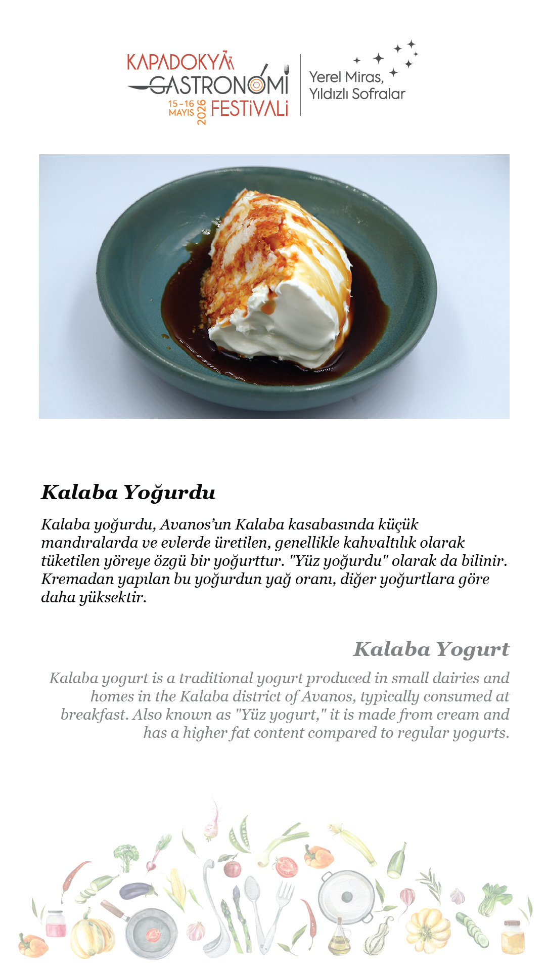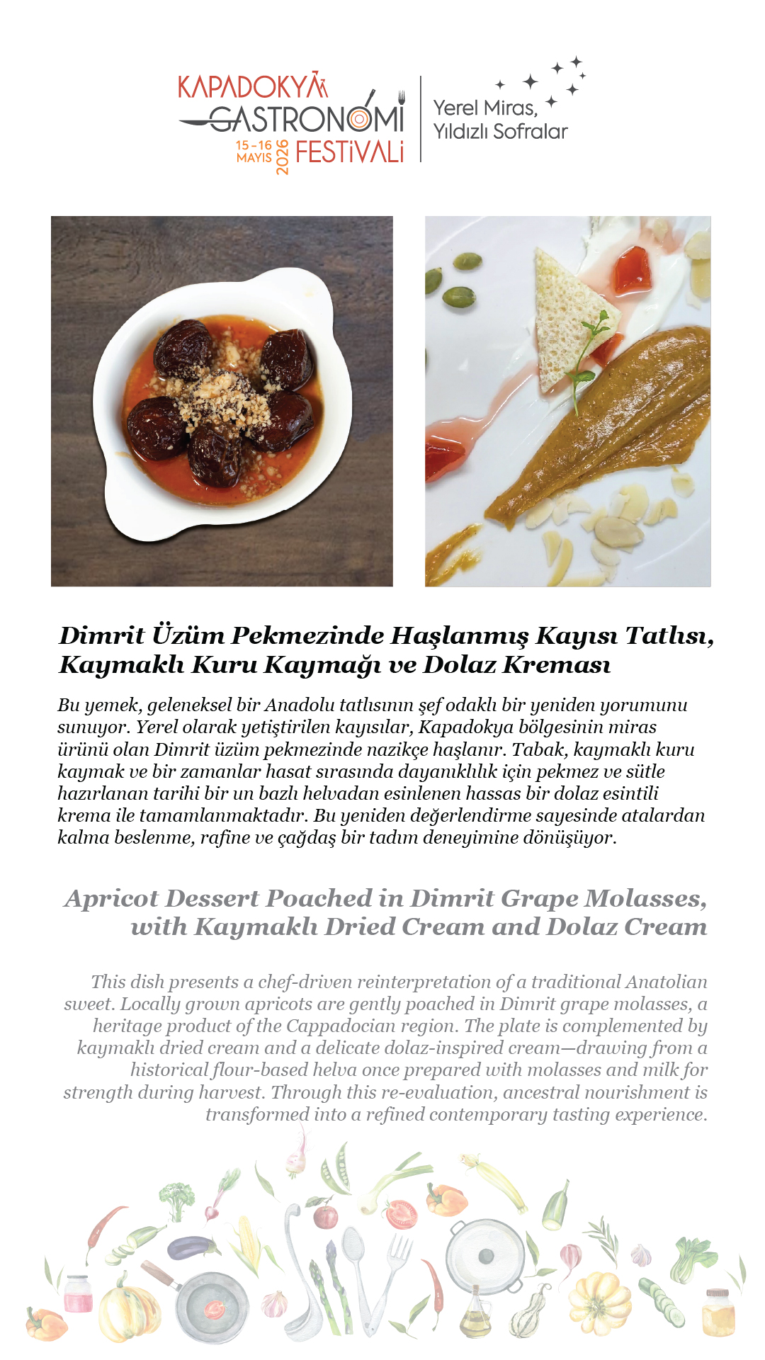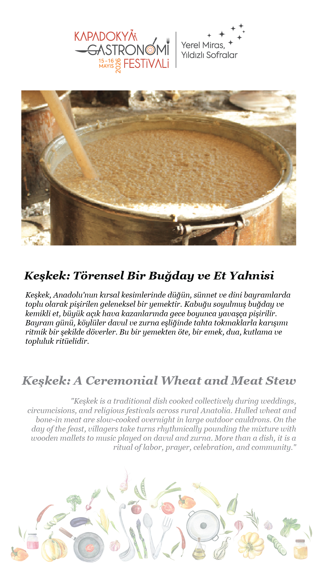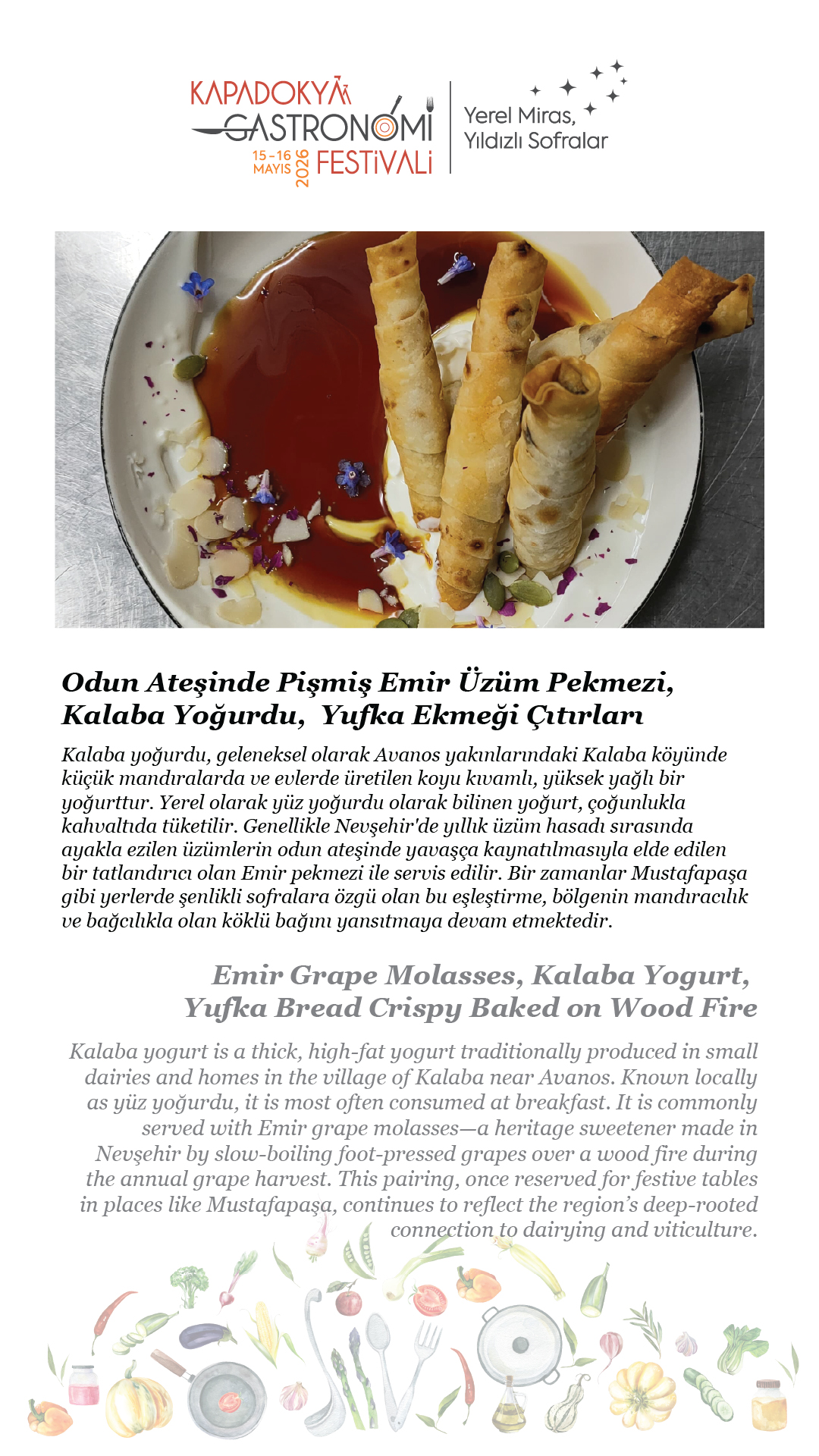 15-16 Mayıs 2026 tarihlerinde, beşincisini gerçekleştireceğimiz Kapadokya Gastronomi Festivali’nde temamız olan “Yerel Miras, Yıldızlı Sofralar”ın hikâyesini paylaşmak için soframıza buyur ediyor; “sofra hazır” diyoruz.