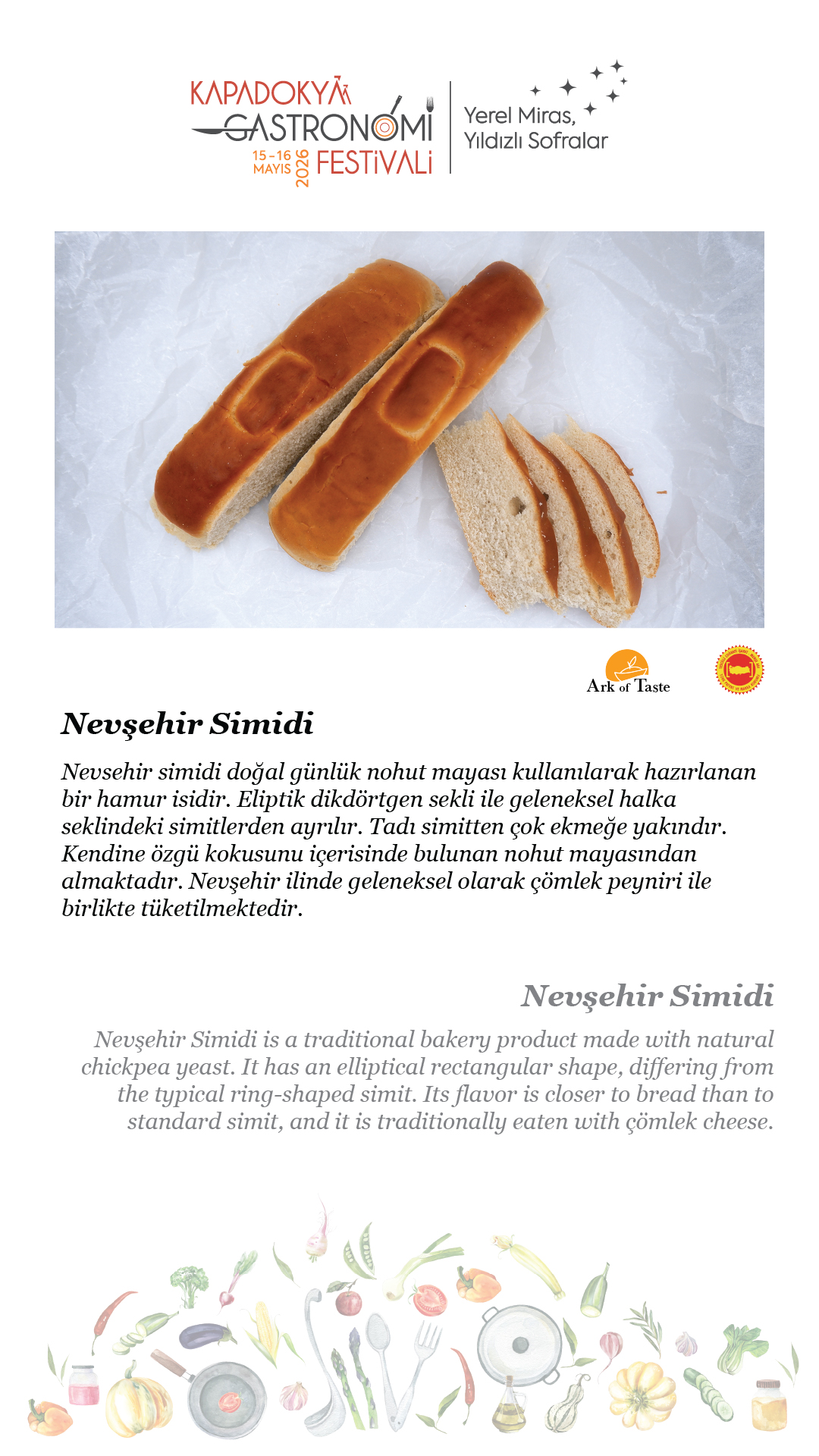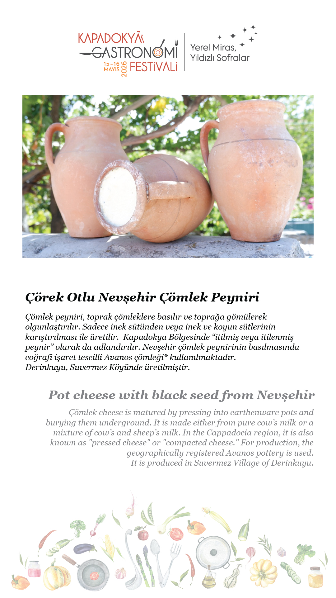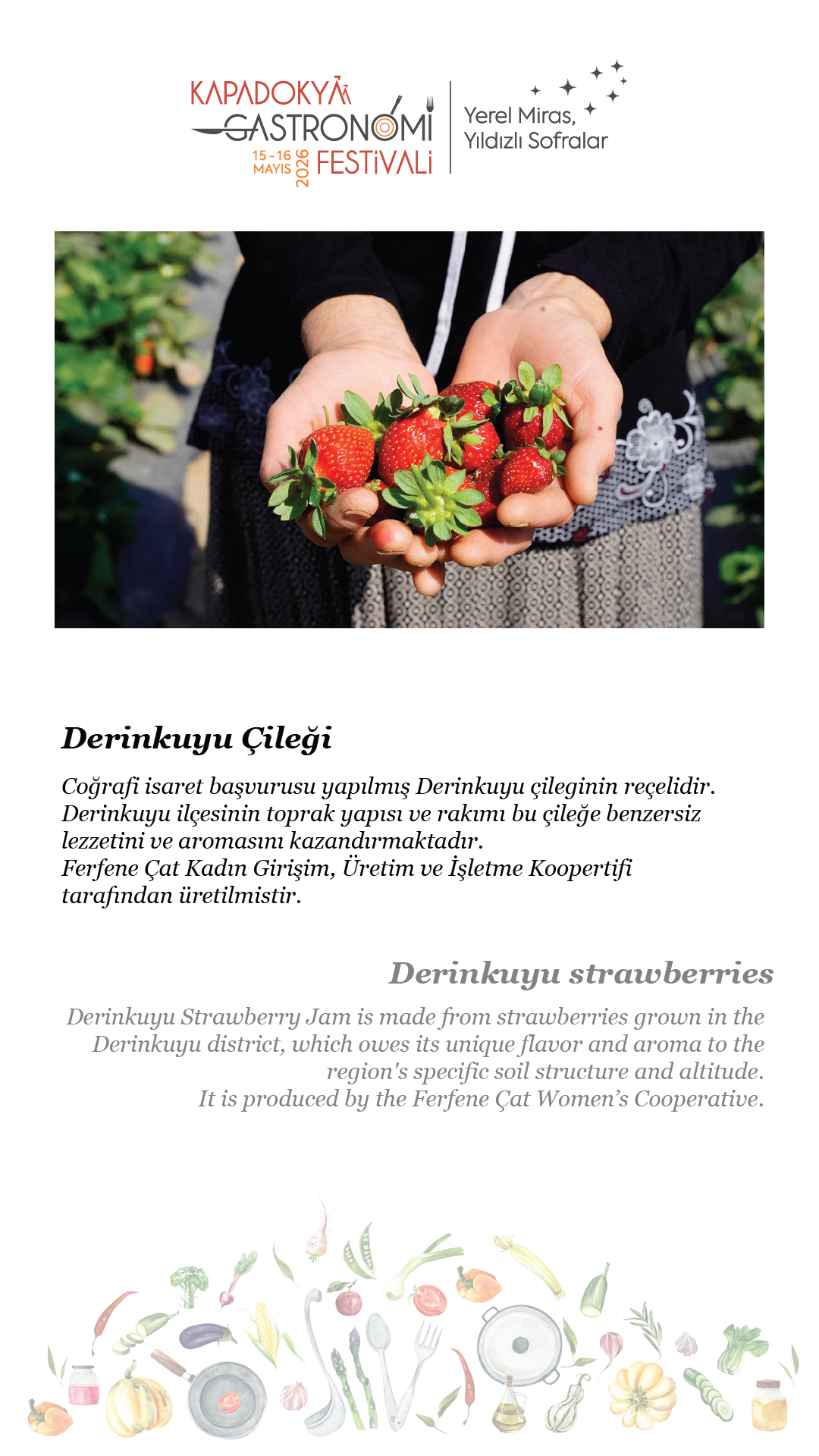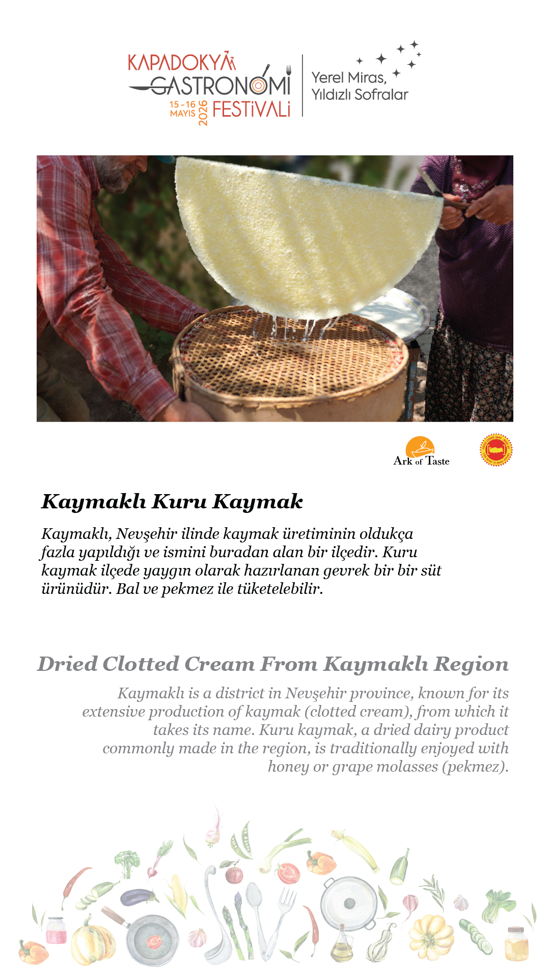 15-16 Mayıs 2026 tarihlerinde, beşincisini gerçekleştireceğimiz Kapadokya Gastronomi Festivali’nde temamız olan “Yerel Miras, Yıldızlı Sofralar”ın hikâyesini paylaşmak için soframıza buyur ediyor; “sofra hazır” diyoruz.