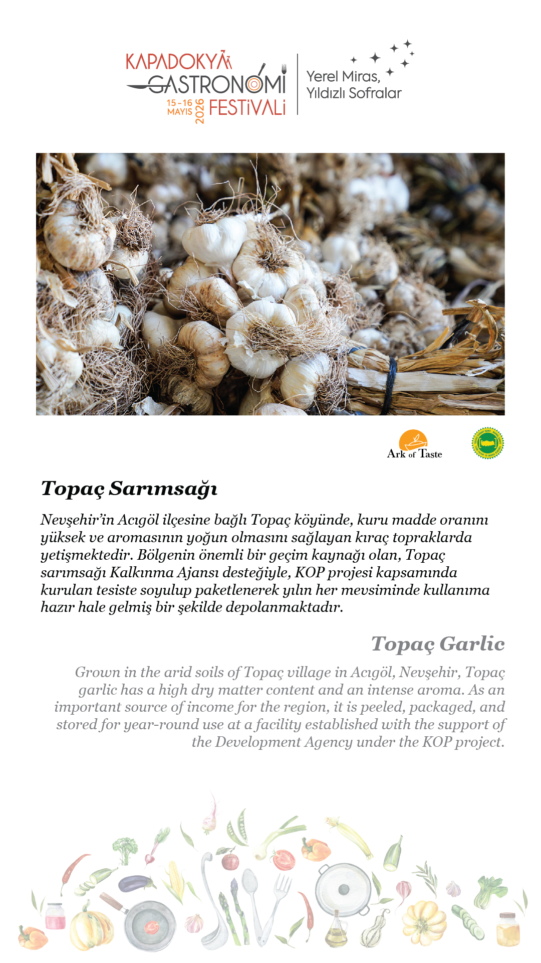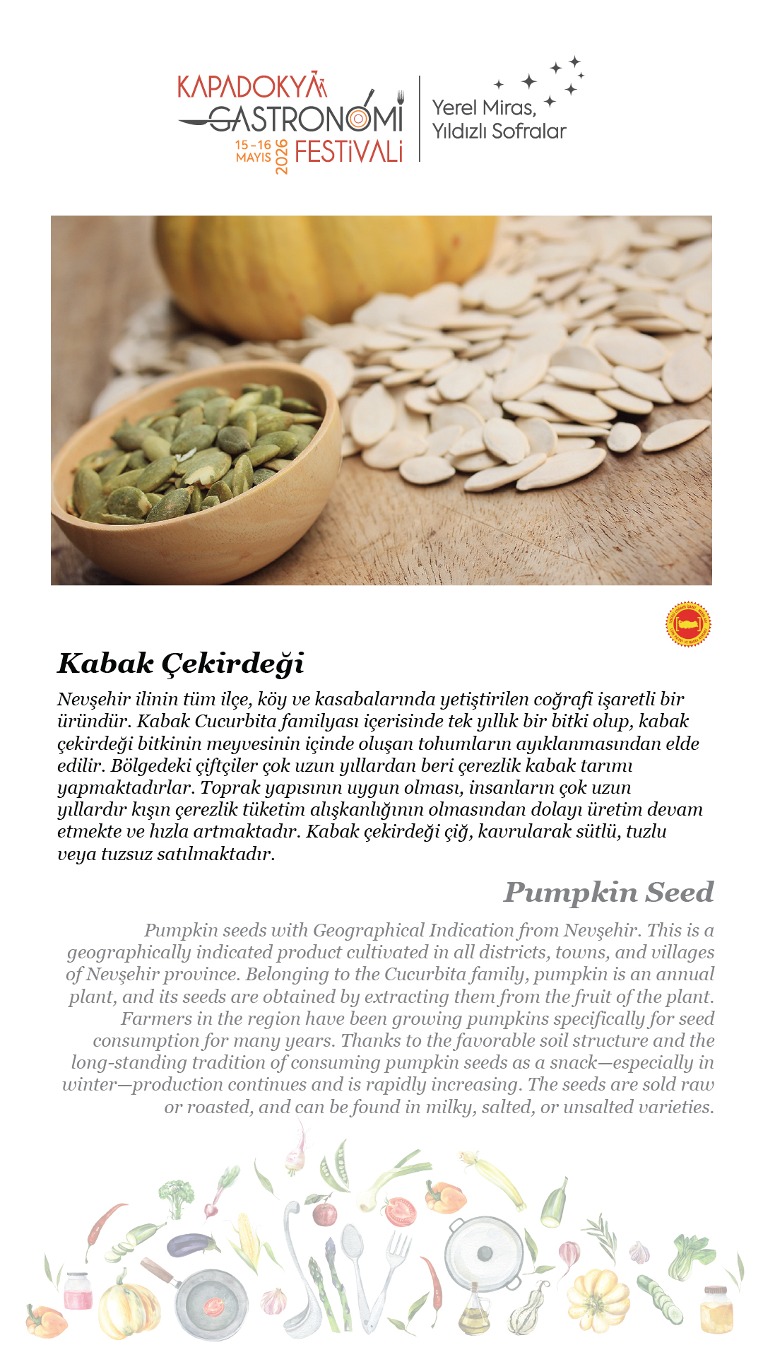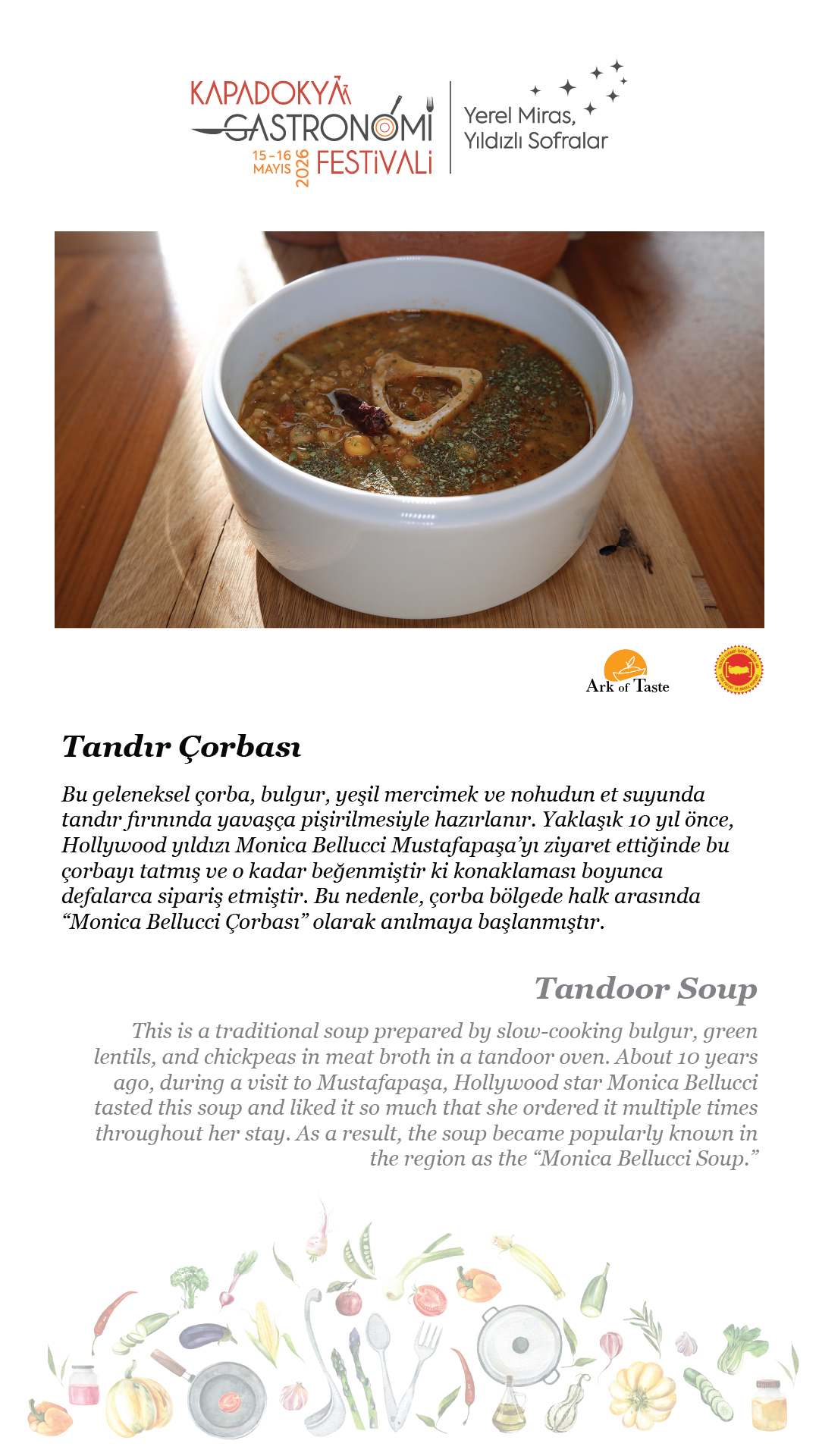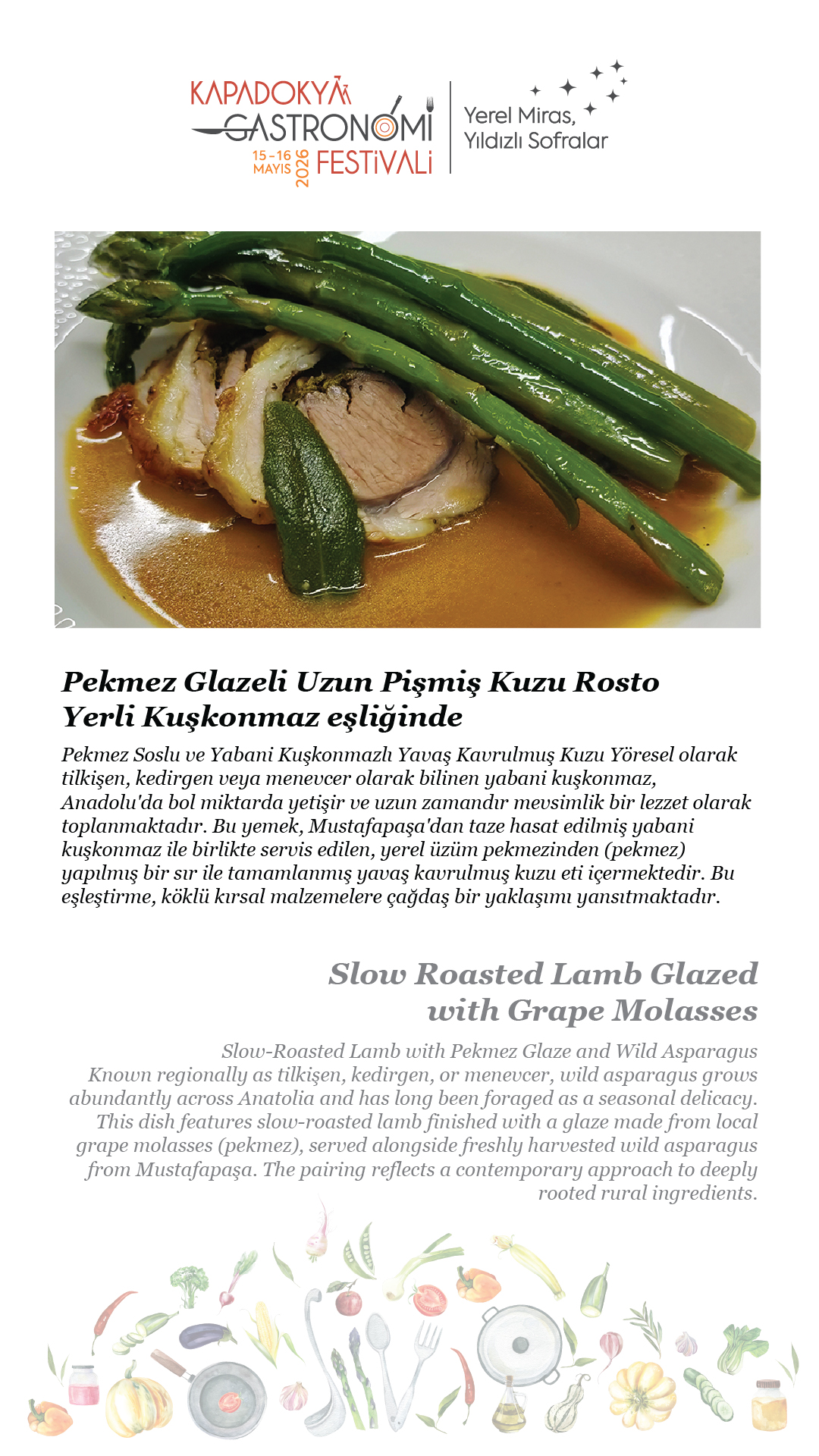 15-16 Mayıs 2026 tarihlerinde, beşincisini gerçekleştireceğimiz Kapadokya Gastronomi Festivali’nde temamız olan “Yerel Miras, Yıldızlı Sofralar”ın hikâyesini paylaşmak için soframıza buyur ediyor; “sofra hazır” diyoruz.